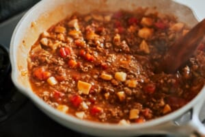 深めのフライパンに油を熱し、玉ねぎ、(1)のエリンギ、ひき肉を入れて2分炒める。A、(1)のトマトの半量を加え、3分煮る。 -