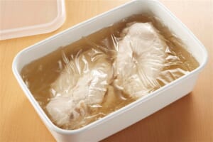 [3]冷めたらゆで汁ごと密閉容器に入れて、汁に浸るようにラップで落としぶたをする。