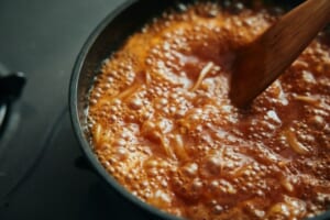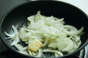 フライパンにバター10g、(1)の玉ねぎを入れ、しんなりするまで炒める。薄力粉を入れ、よくからめ、Aを加えて混ぜ合わせ、ソースを作る。 -
