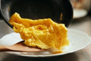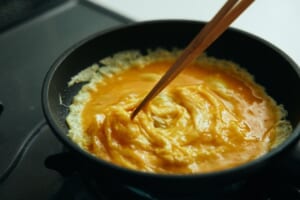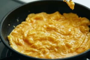 フライパンにオリーブオイルを入れて強火で熱し、(4)の溶き卵を一気に注ぐ。すばやく大きくかき混ぜ、しっかりとヒダを作り、表面がまだ生のうちに火を止め、余熱で数秒おく。 -