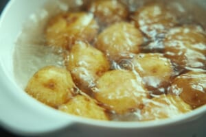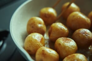 フライパンにバターを溶かし、(2)の新じゃがいもを転がしながら、きつね色になるまで炒め、塩をふる。 -