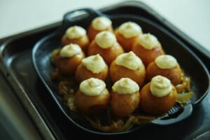 耐熱皿に(4)の玉ねぎを敷き、(3)のじゃがいもを並べ、それぞれ「ピュアセレクトマヨネーズ」適量をしぼる。 -
