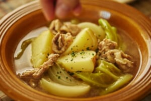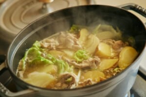 鍋に油を熱し、(1)の豚肉を入れて炒める。肉の色が変わったら、A、(1)のじゃがいも・玉ねぎ・キャベツを加え、煮立ったらアクを取り、10分ほど煮る。 -
