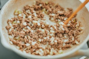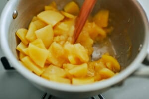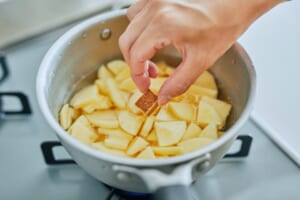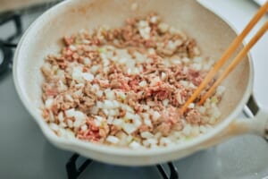 鍋に(1)の白菜・ベーコン、Aを入れて火にかけ、煮立ったら、弱火にして5分ほど煮る。