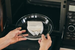 豆腐はキッチンペーパーで包み、耐熱容器に入れてラップをかけずに、電子レンジ(600W)で2~3分加熱し、水気を拭き取る。ほうれん草はザク切りにする。 -