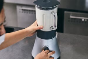 ミキサーに(1)の豆腐、Aを入れ、なめらかになるまで撹拌する。 -