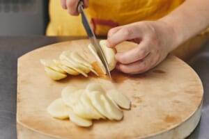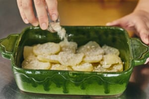 じゃがいもは3mm幅の薄切りにし、水にさらして水気をきる。耐熱ボウルに入れ、ラップをかけて電子レンジで3分ほど加熱する。 -