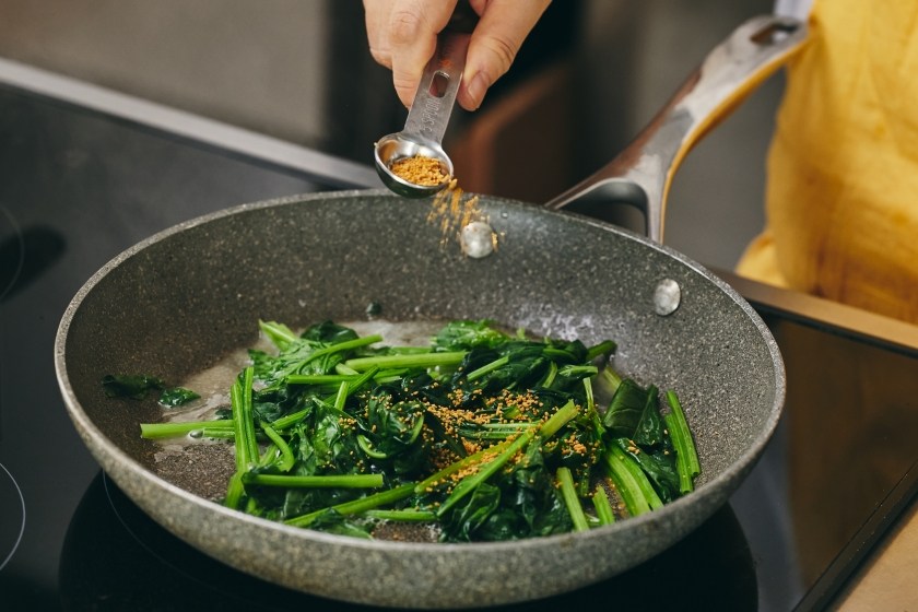 フライパンにバターを入れて火にかけ、バターが溶けたら、(1)のほうれん草を加えて炒める。しんなりしたら、弱火にし、「コンソメ」、(2)を加えてよく混ぜ合わせ、火を止める。 -