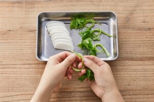 かまぼこは薄切りにする。みつばは2~3本ずつにまとめ、茎をひと結びする。 -