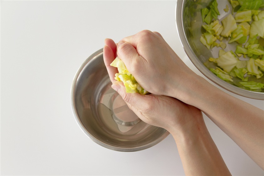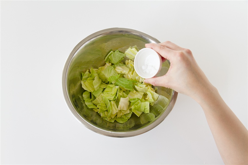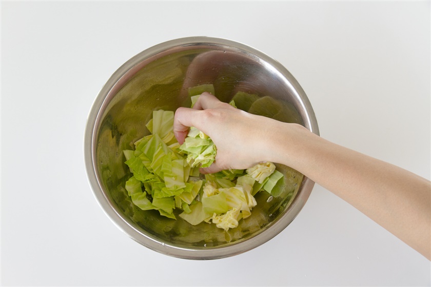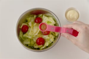 ボウルに(1)のキャベツ・ミニトマトを入れ、「コンソメ」を加えてまぶし、