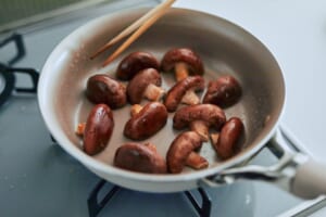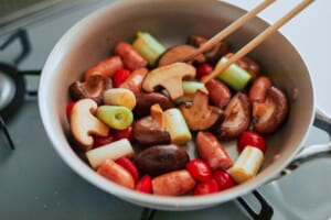 鍋にA、(1)の白菜の芯・ハムを入れて火にかけ、煮立ったら、弱火で5分煮る。 -