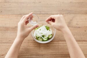 耐熱容器にAを入れて、ラップをかけて電子レンジ(600W)で20秒ほど加熱し、砂糖が溶けるまで混ぜ、(2)のなすを加え、味がなじむまで浸す。 -