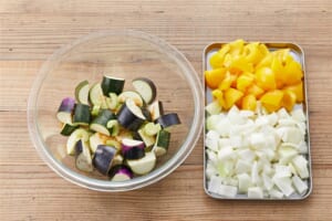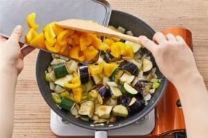 (1)のズッキーニ・なす・セロリを加え、中火でしんなりするまで丁寧に炒める。