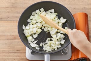 フライパンにオリーブオイルを弱火で熱し、(1)の玉ねぎ、にんにくを入れ、全体に