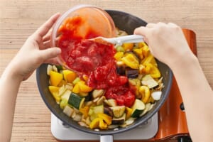 トマトは粗くつぶして缶汁ごと加え、Aを加えて、サッと混ぜ合わせフタをして