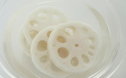 ※れんこんは切り口が空気にふれると黒っぽく変色するので、水にさらす。