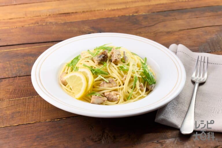 材料:レモン,Aおろしにんにく(チューブ),A「味の素KKコンソメ」顆粒タイプ,A「AJINOMOTO オリーブオイル」,Aレモン汁,水菜,さば水煮缶,スパゲッティ -