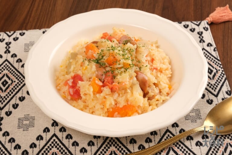 材料:粉チーズ,パセリのみじん切り,粗びき黒こしょう,ピザ用チーズ,水,A「瀬戸のほんじお」,A「味の素KKコンソメ」固形タイプ,Aバター,にんじん,玉ねぎ,トマト,ウインナーソーセージ,米 -