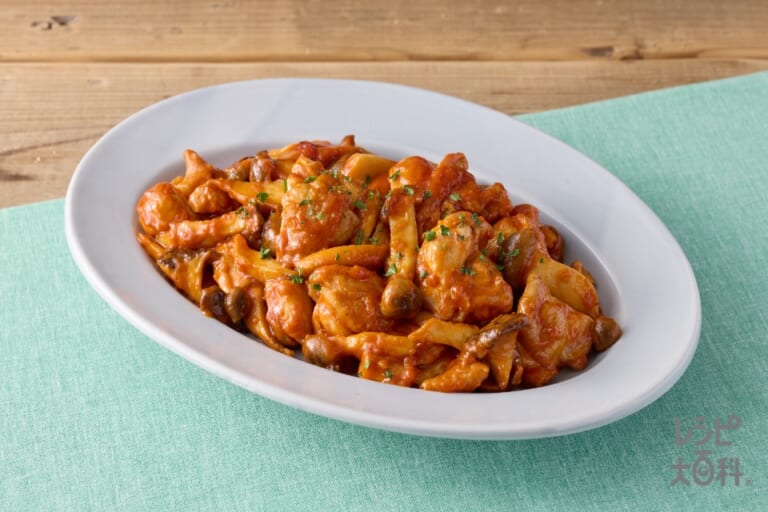 材料:ドライパセリ,バター,「Bistro Do」濃厚トマトクリーム鶏ポテチーズ用,エリンギ,しめじ,こしょう,「瀬戸のほんじお」,鶏もも肉 -