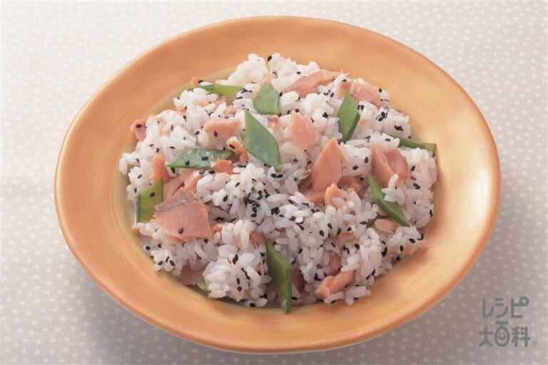 材料:「AJINOMOTO 大豆の油」,ご飯,絹さや,こしょう,「瀬戸のほんじお」,卵,「味の素KKコンソメ」顆粒タイプ,豚ひき肉 -