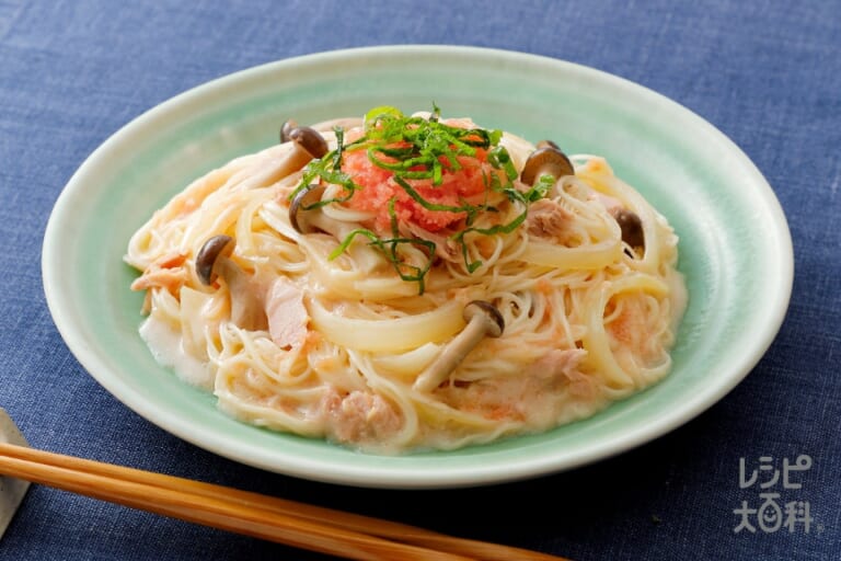 材料:青じそ,Aしょうゆ,A「ほんだし」,A調整豆乳,玉ねぎ,しめじ,ツナ水煮缶,たらこ,そうめん -