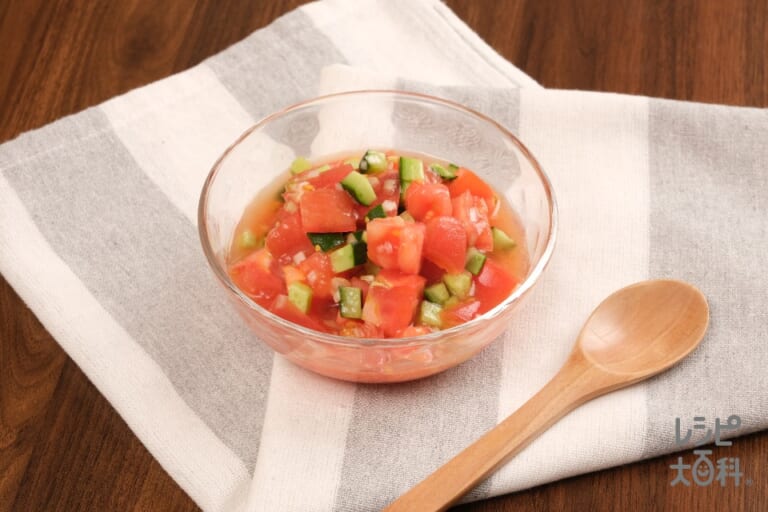 材料:A「丸鶏がらスープ」,A「パルスイート」,Aレモン汁,Aナンプラー,赤唐がらし(乾),にんにく,刻みピーナッツ,ミニトマト,きゅうり,「瀬戸のほんじお」,すいか -
