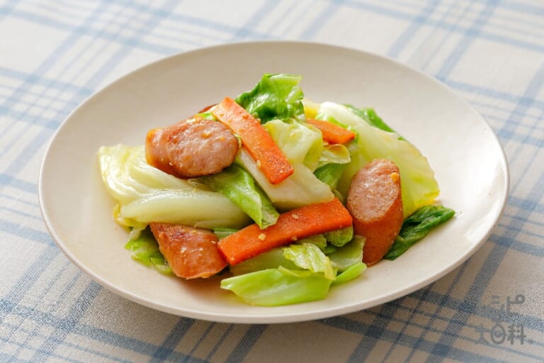 材料:「AJINOMOTO サラダ油」,A砂糖,Aみりん,A「ほんだし」,Aみそ,ウインナーソーセージ,にんじん,キャベツ -
