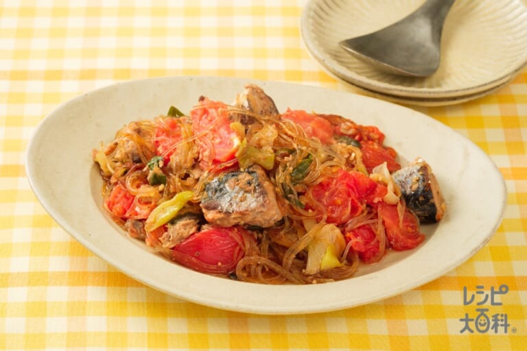 材料:「AJINOMOTO ごま油好きの純正ごま油」,Aしょうゆ,A「Cook Do」オイスターソース,A水,にんにく,春雨(乾),長ねぎ,トマト,さば水煮缶 -