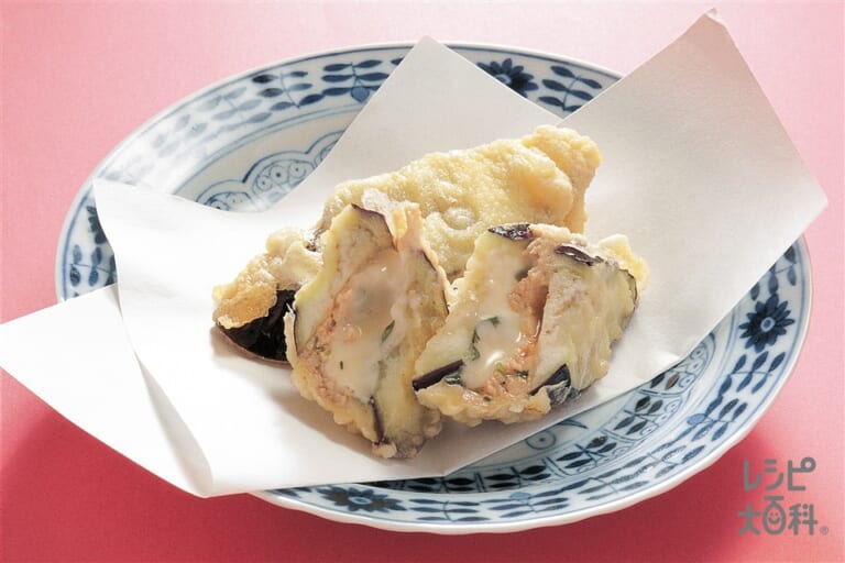 材料:「AJINOMOTO 大豆の油」,B薄力粉,B冷水,B溶き卵,青じそ,プロセスチーズ,しょうがのみじん切り,ねぎのみじん切り,Aこしょう,Aうま味調味料「味の素®」,A溶き卵,豚ひき肉,片栗粉,なす -
