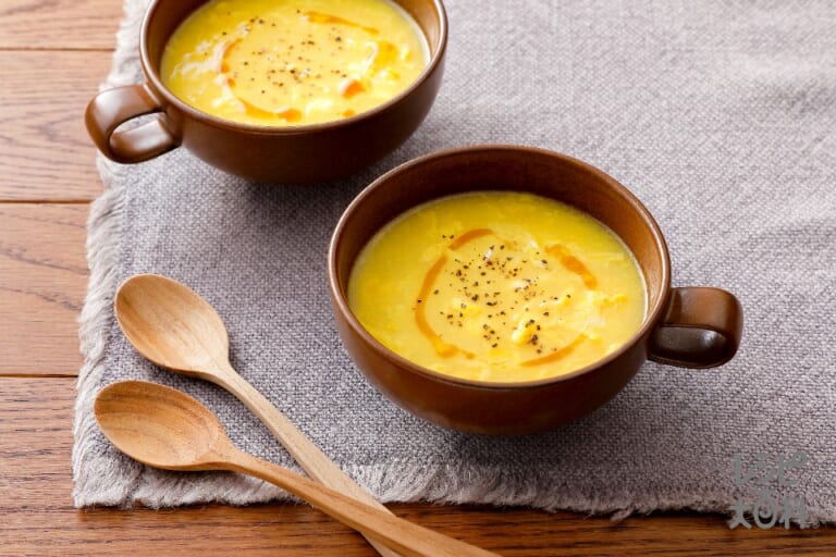 材料:「AJINOMOTO サラダ油」,「クノール たんぱく質がしっかり摂れるスープ」コーンクリーム,牛乳,卵,ホットケーキミックス -