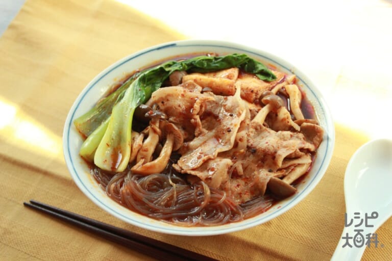 材料:A「丸鶏がらスープ」,A「Cook Do」極(プレミアム)麻辣回鍋肉用,A水,豚バラ薄切り肉,油揚げ,チンゲン菜,しめじ,春雨(乾)