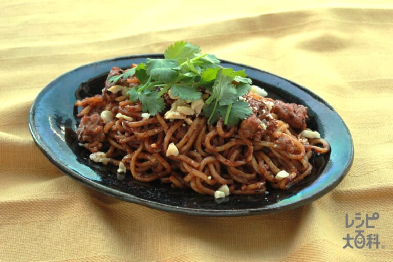 材料:パクチー,ミックスナッツ,「Cook Do」極(プレミアム)麻辣回鍋肉用,豚ひき肉,水,焼きそば用蒸しめん -