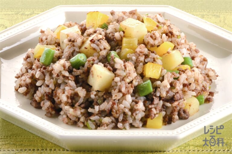 材料:こしょう,「瀬戸のほんじお」,「Cook Do」オイスターソース,「ピュアセレクト サラリア」,ご飯,ねぎのみじん切り,さやいんげん,じゃがいも,パプリカ(黄),牛ひき肉 -