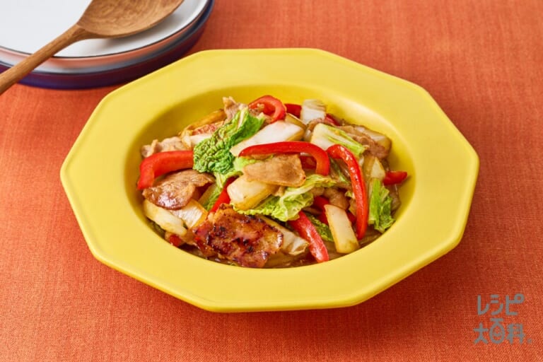 材料:「AJINOMOTO サラダ油」,A「ピュアセレクト マヨネーズ」,A「Cook Do」オイスターソース,パプリカ(赤),白菜,豚バラ薄切り肉 -