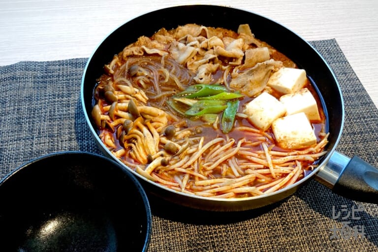 材料:すり白ごま,「AJINOMOTO サラダ油」,A「Cook Do KOREA!」豆腐チゲ用,A水,しめじ,長ねぎ,じゃがいも,豚バラ薄切り肉 -