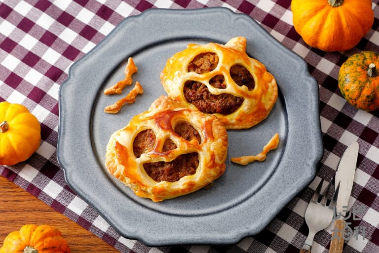 材料:「AJINOMOTO サラダ油」,卵黄,薄力粉,A「味の素KKコンソメ」顆粒タイプ,A「クノール 贅沢野菜」<栗かぼちゃ>,玉ねぎ,合いびき肉,冷凍パイシート -